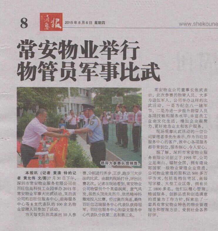 在2015年八一建軍節(jié)即將來臨之際,公司上下歡聚在百旺信高科技工業(yè)園,舉辦軍事隊列比武,一方面慶祝中國人民解放軍建軍88周年,另一方面向大家宣傳強身健體的觀念,同時向各位業(yè)主展示公司秩序維護隊伍的專業(yè)性和可靠性。每個服務(wù)中心代表隊都意氣風(fēng)發(fā)、斗志昂揚,充分展示了自己的實力,收獲了屬于自己的榮譽。