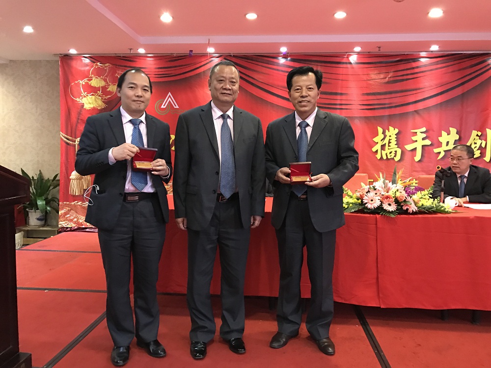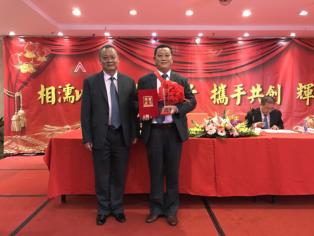 3、張總代表公司領導班子給20年老員工(何國兵總經理助理和羅韶坤主任)頒發(fā)“二十年長期服務獎”金牌,表彰老員工20年以來對公司的付出,鼓勵公司所有員工再接再厲。