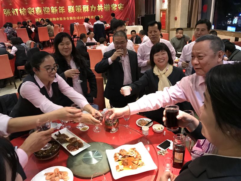 5、在場員工與老員工共進豐富晚宴,晚宴中,公司領導班子端起酒杯到每一桌送去祝福,并向退休老員工發(fā)放慰問津貼。