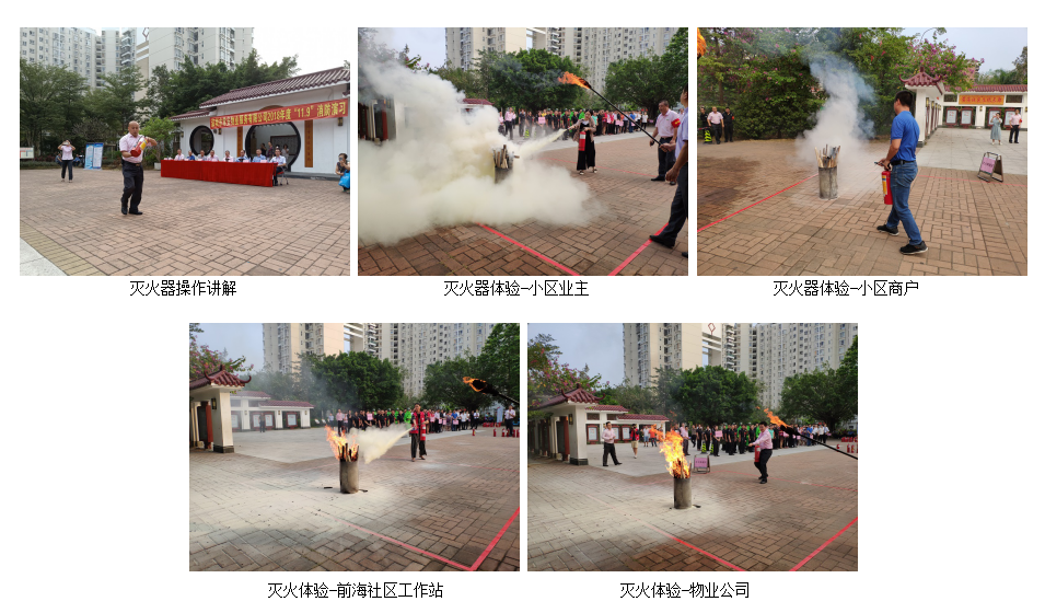 在確認現(xiàn)場火情得到控制的情況下,現(xiàn)場指揮組織各應急小組到前海花園三期廣場集合,前?;▓@物業(yè)服務中心秩序維護隊長為現(xiàn)場所有人員詳細講解了ABC干粉滅火器的使用方法,隨后組織了約10%的參與演習人員開啟滅火器操作體驗。